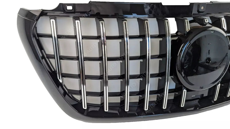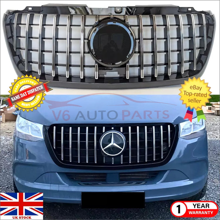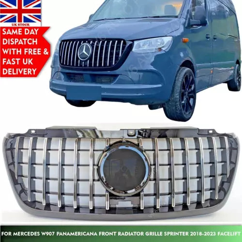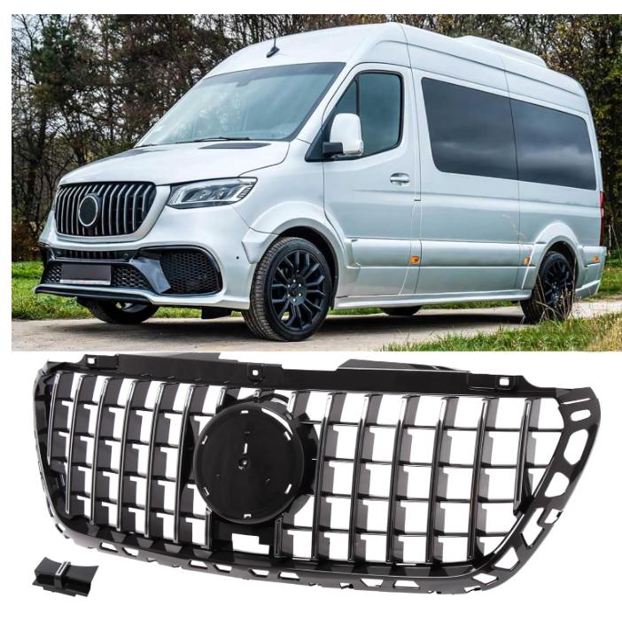 Compatible with Mercedes, Luxury car upgrade, Panamericana grille, Chrome front grille, GT style grille for Mercedes, High-performance Sprinter grille, Aggressive car styling, Aftermarket Mercedes grille, Facelift grille for Sprinter, Mercedes W907 front grille, Custom Mercedes front bumper grille, Glossy chrome grille, Sporty grille for Mercedes, Premium front bumper design, Mercedes Sprinter GT grille, Facelift radiator grille.