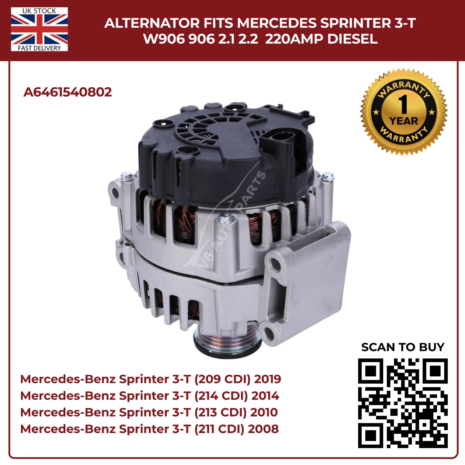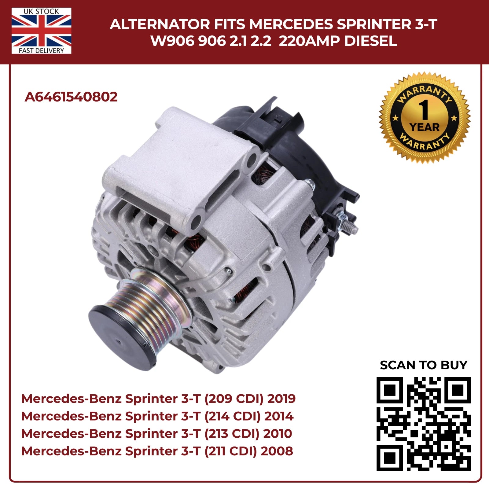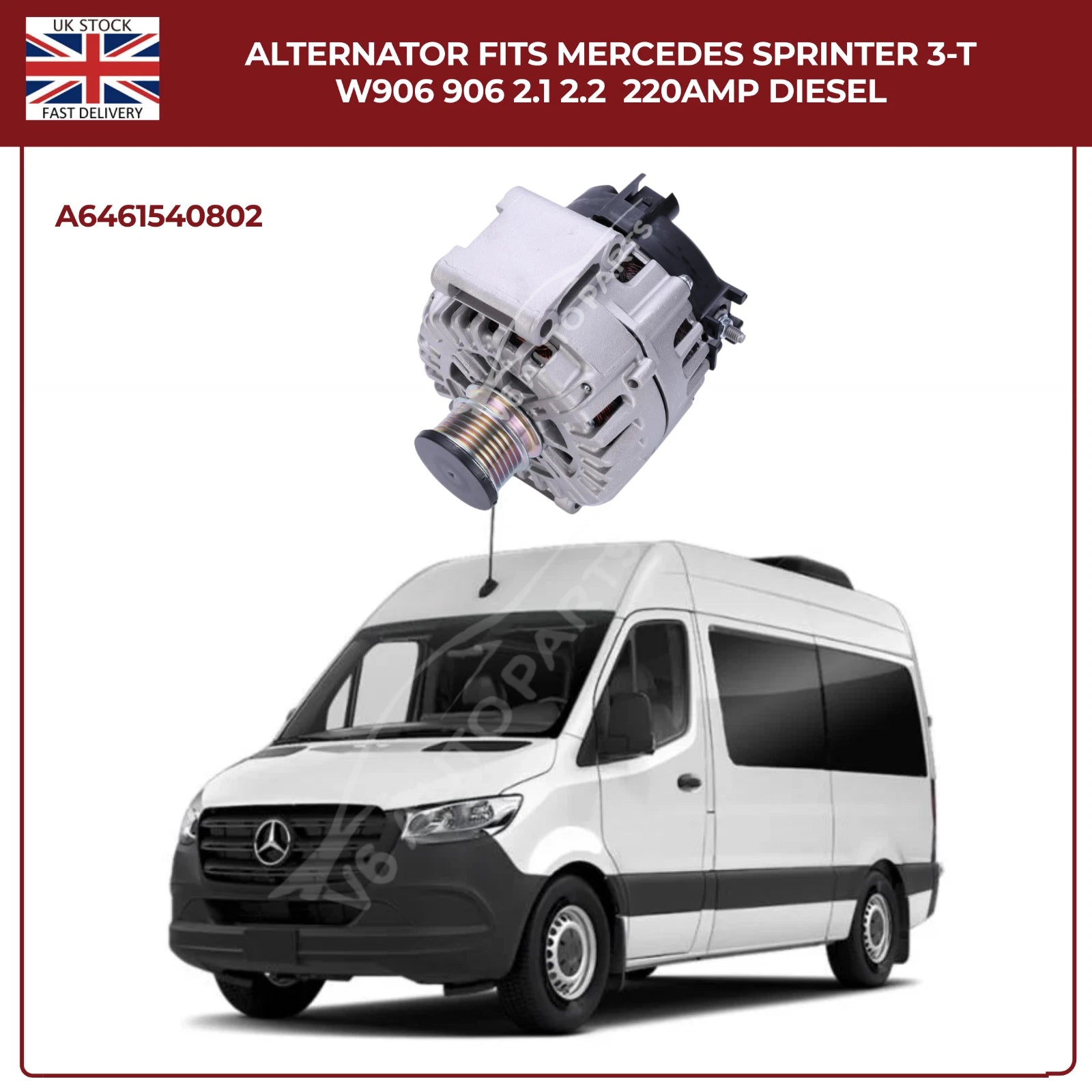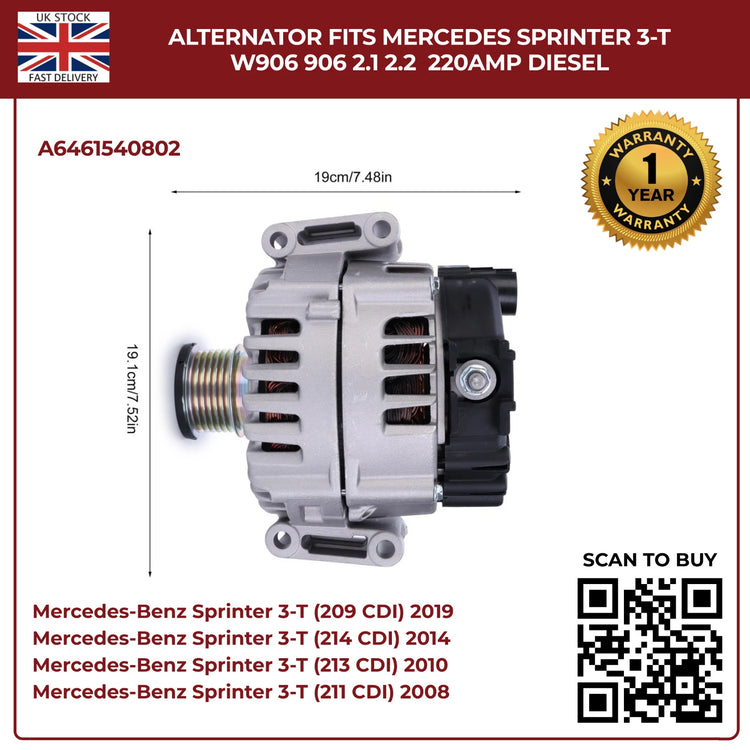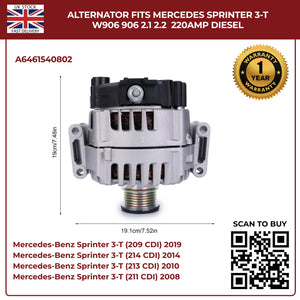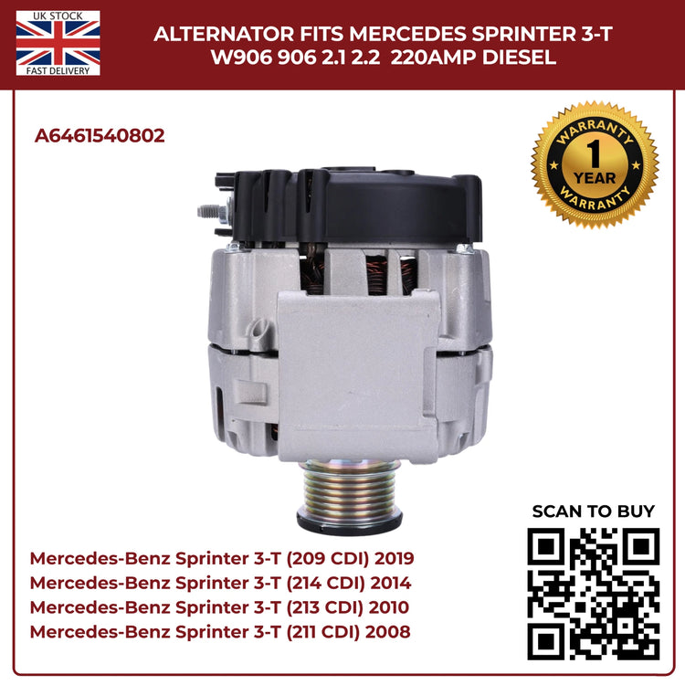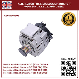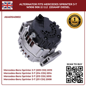220AMP Alternator Fits Mercedes-Benz Sprinter W906 (2006–2018) 2.1L / 2.2L Diesel – OEM A6461540802 Replacement