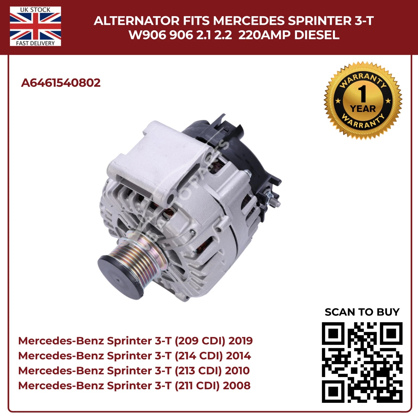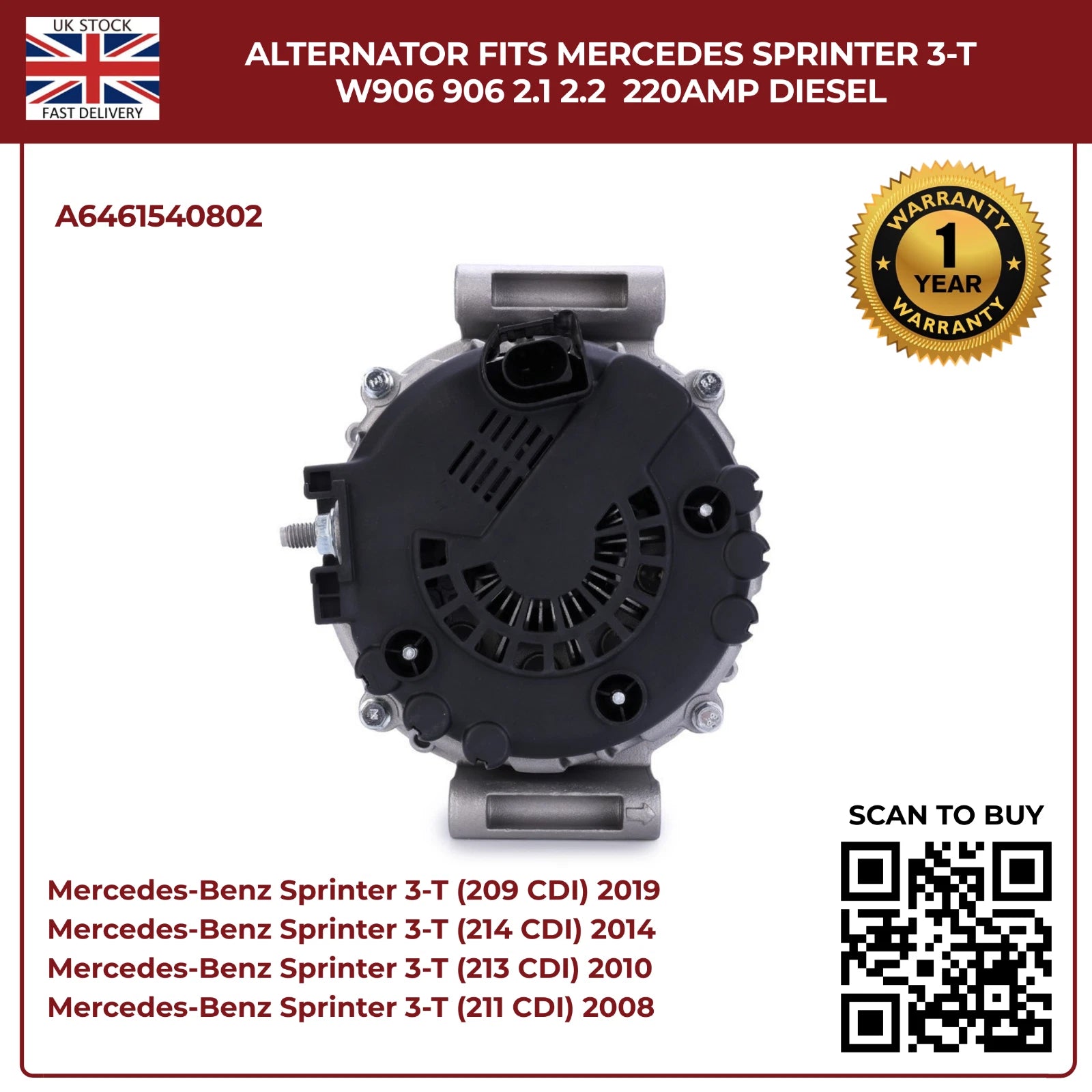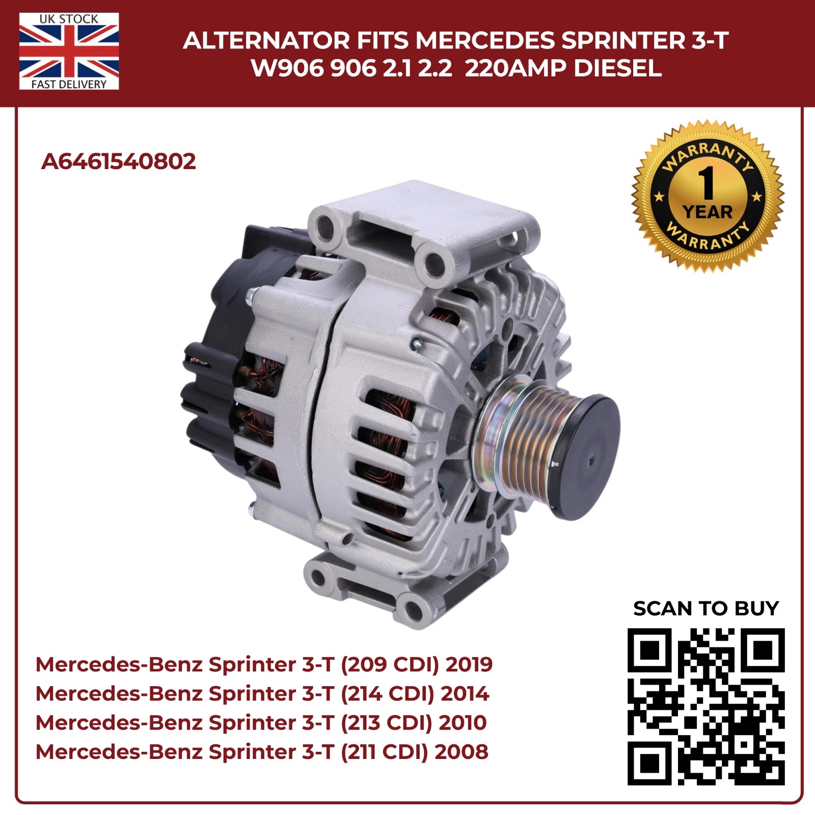 220AMP Alternator Fits Mercedes-Benz Sprinter W906 (2006–2018) 2.1L / 2.2L Diesel – OEM A6461540802 Replacement
