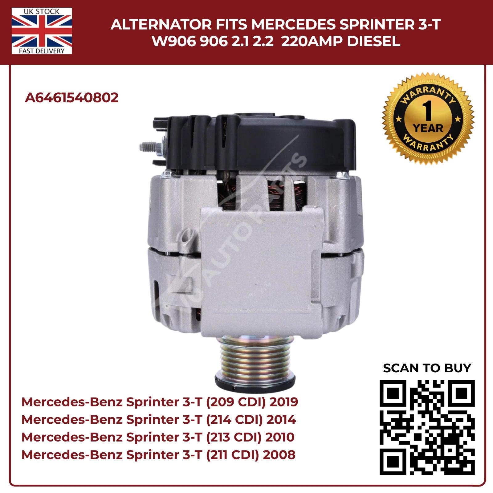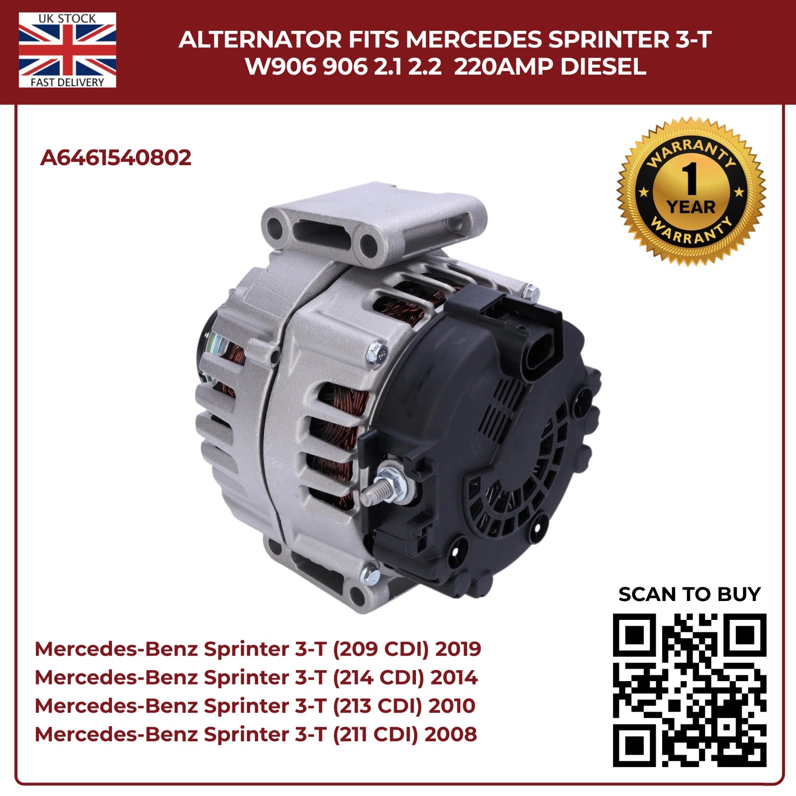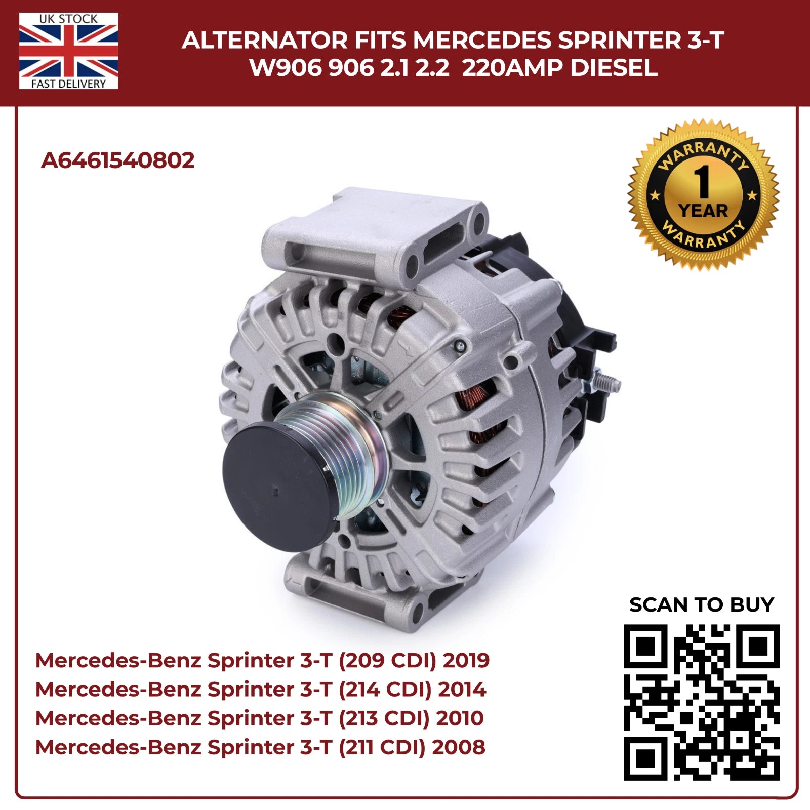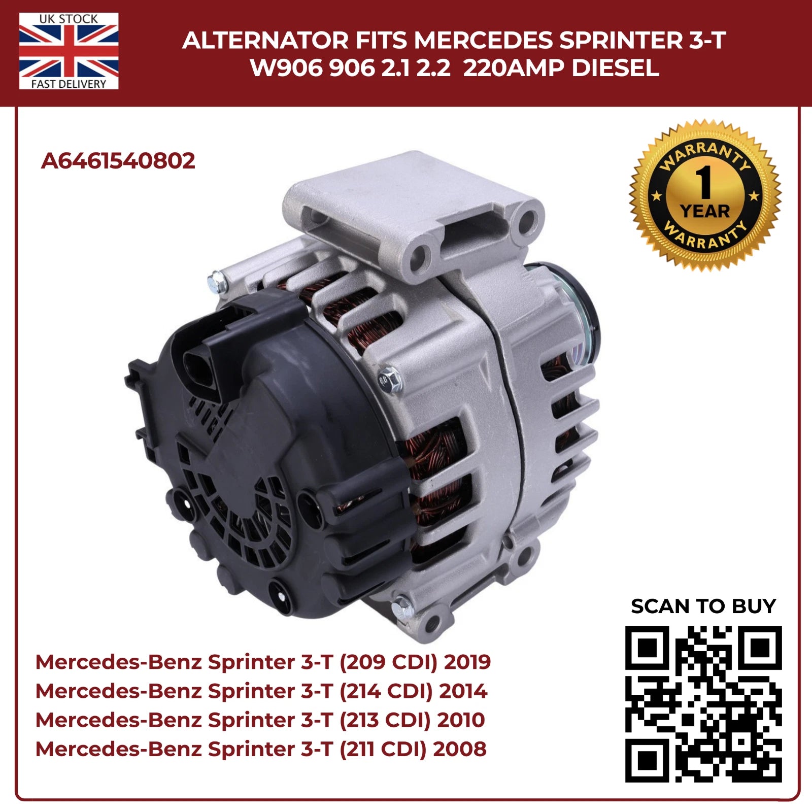 220AMP Alternator Fits Mercedes-Benz Sprinter W906 (2006–2018) 2.1L / 2.2L Diesel – OEM A6461540802 Replacement