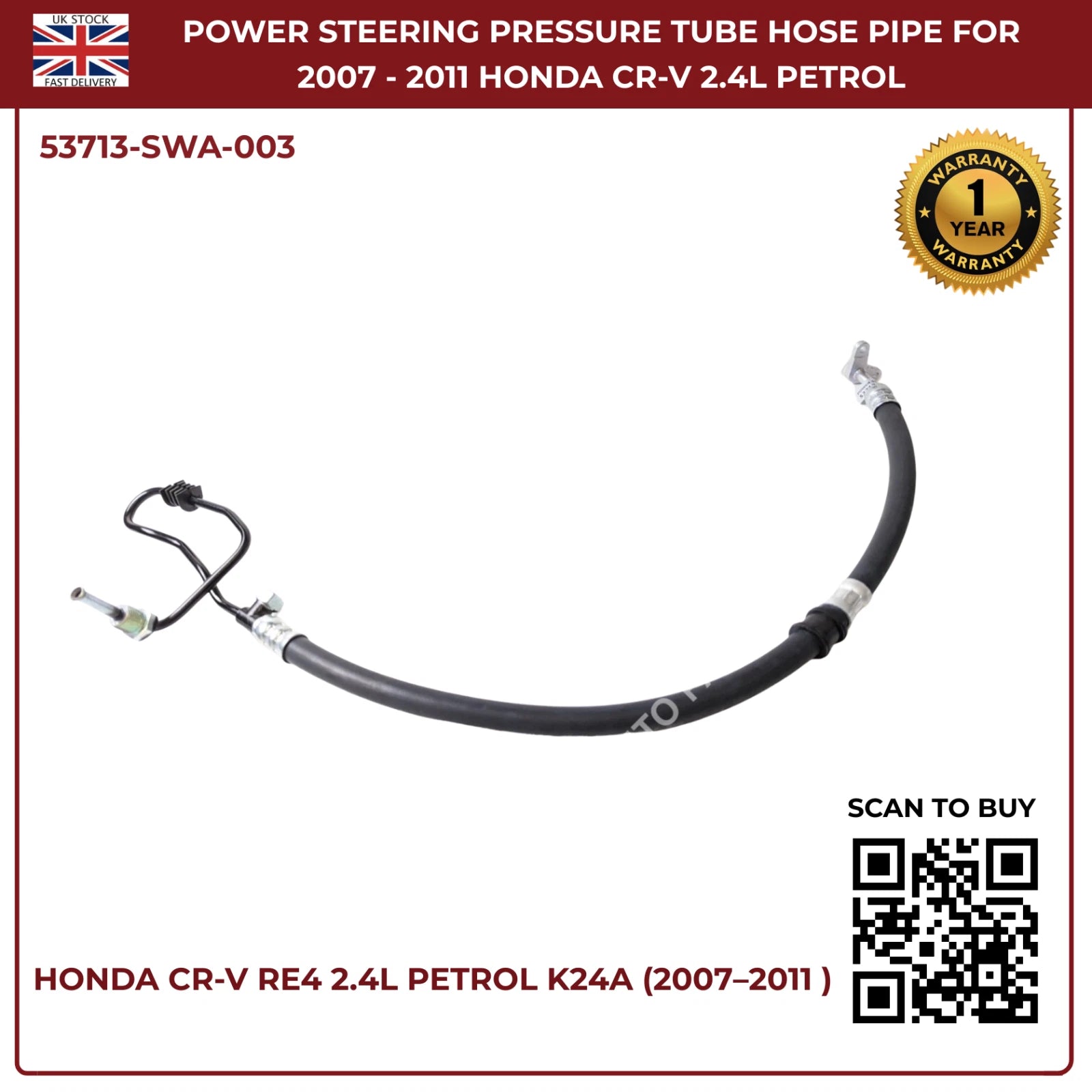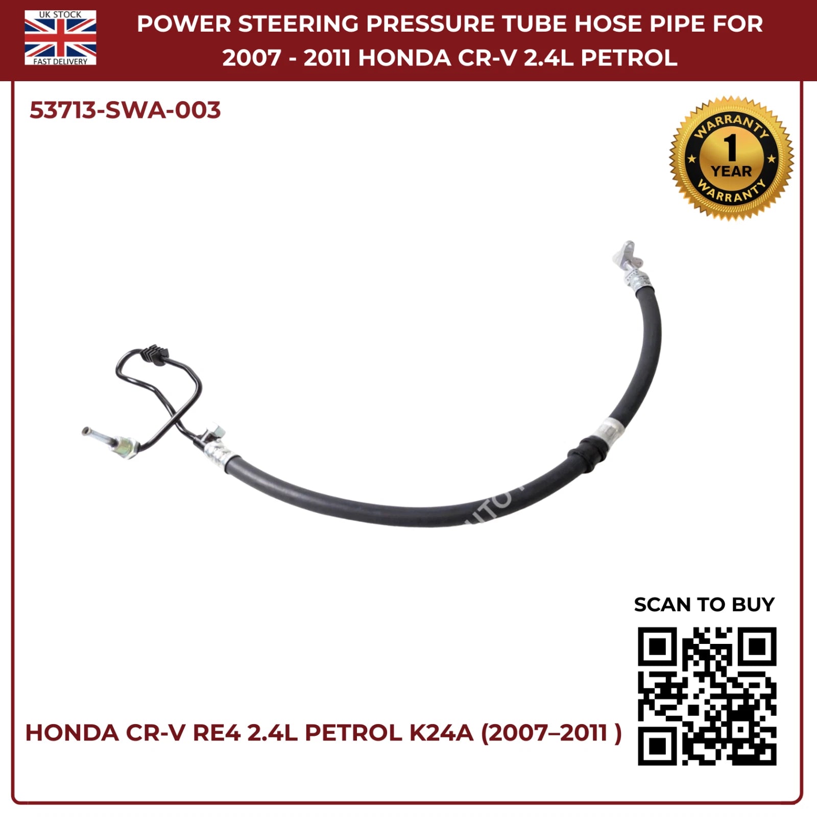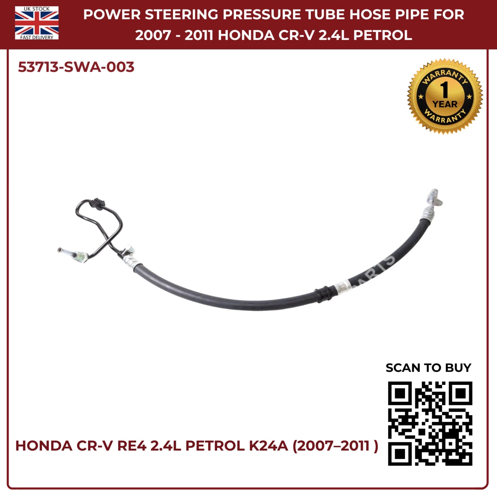 Honda CR-V Power Steering Pressure Hose PIPE 53713-SWA-003 RHD 2.4L RE4 (2007–2011)
