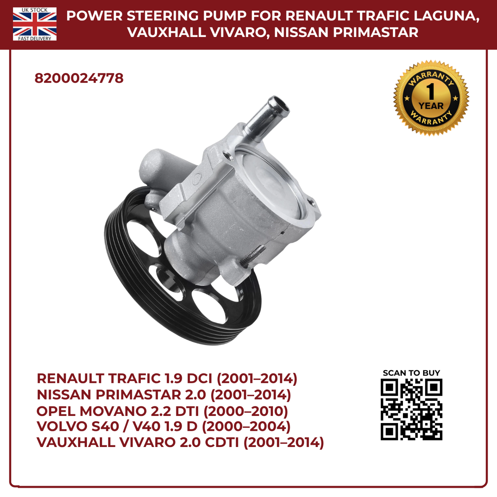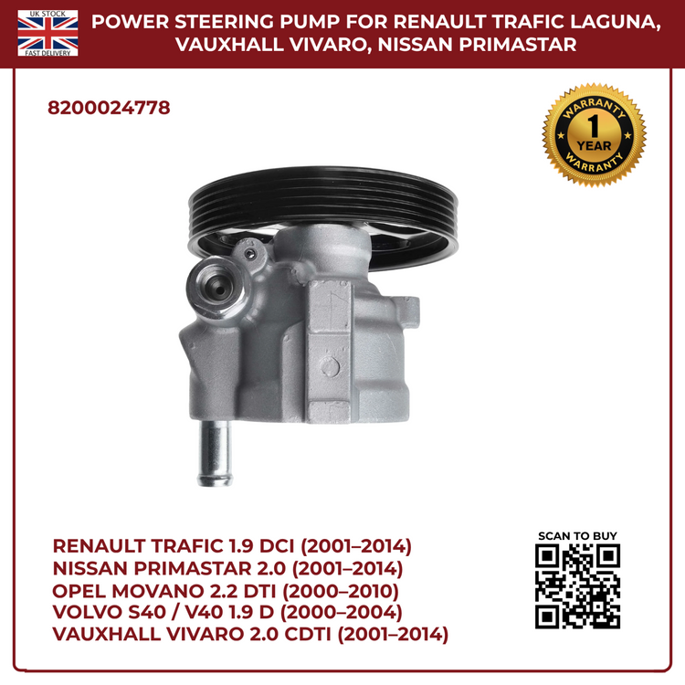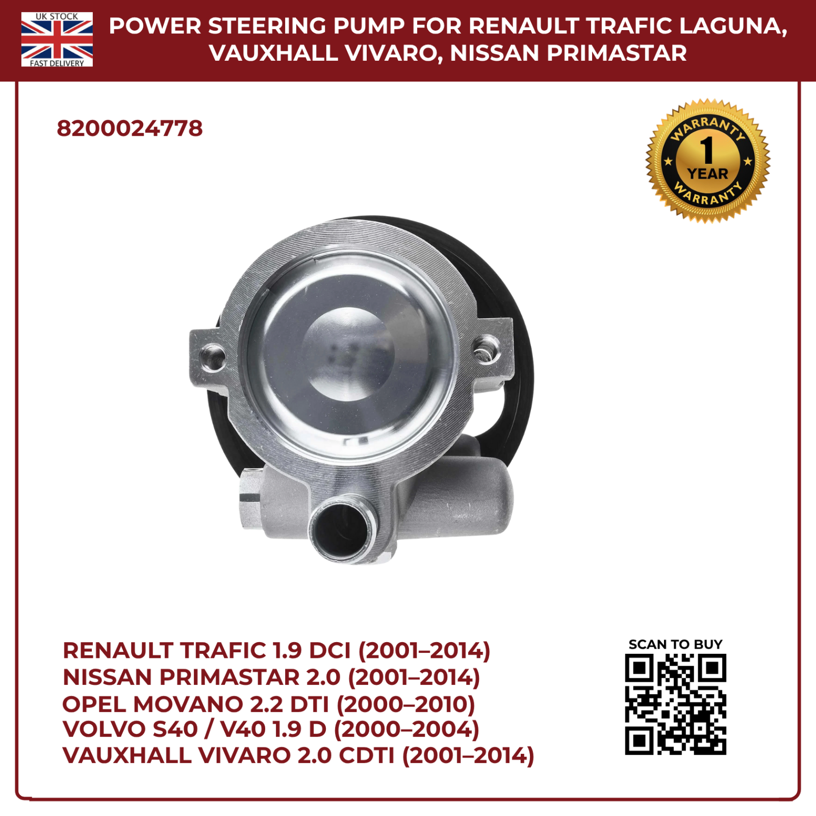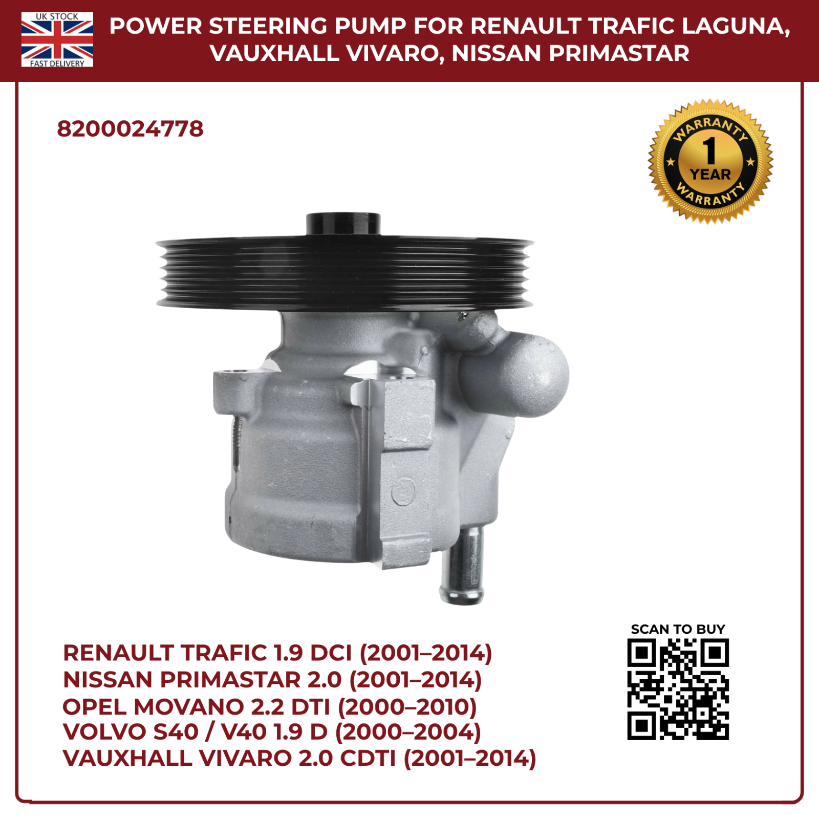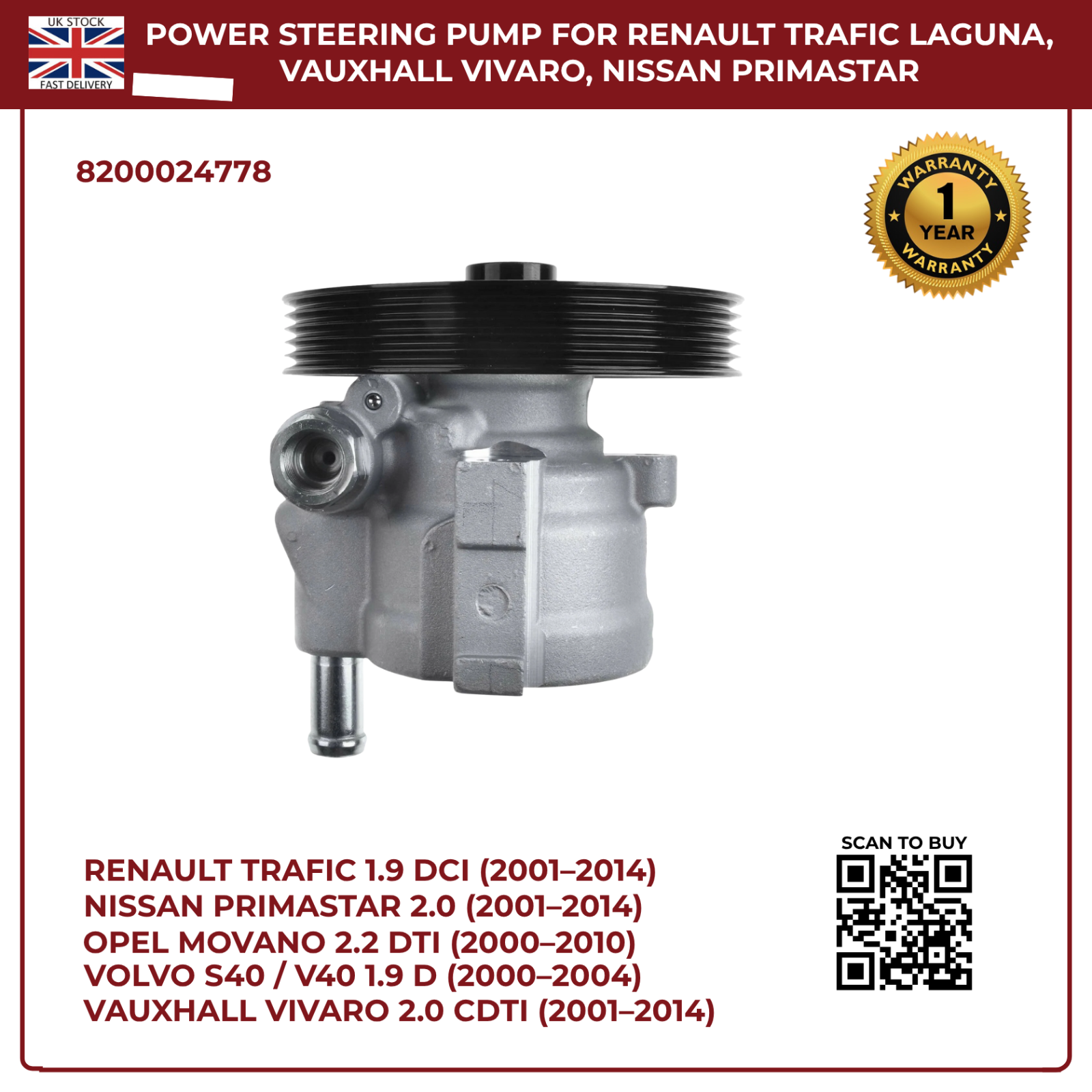Make Model Years Engine size / Type Engine code / notes Renault Trafic 2001–2014 1.9 dCi; 2.0 dCi F9Q; common mid-engined diesel Trafic pump — verify pulley type and stamping Renault Master 2000–2010 2.2 dCi; 2.5 dCi G9T; commercial diesel variants with external hydraulic lines Renault Laguna 2001–2007 1.9 dCi F9Q; confirm mounting bracket and flange orientation Renault Scenic / Megane (select) 2000–2006 1.9 dCi F9Q; check pump flange and bolt pattern Nissan Primastar 2001–2014 1.9 dCi; 2.0 petrol F9Q diesel variants; common cross-reference OE 8200024778 Nissan Interstar / NV400 2002–2014 2.2 dCi; 2.5 dCi G9T; mirrors Renault/Opel commercial van fitments Nissan Primastar (3.0 diesel variants) 2003–2010 3.0 dCi Some chassis use a variant cross-referenced to 8200024778; confirm stamping Opel Vivaro 2001–2014 1.9 DTI / 1.9 CDTi; 2.0 CDTi F9Q platform-shared with Trafic; connector and mount often identical Opel Movano 2000–2010 2.2 DTI; 2.5 CDTi Commercial models; confirm hose fittings and bracket Vauxhall Vivaro 2001–2014 1.9 DTI; 2.0 CDTi Same as Opel Vivaro; cross-lists include 8200024778 Vauxhall Movano 2000–2010 2.2 DTI Mirrors Opel Movano fitment; verify hose and bolts Mitsubishi Carisma 2000–2006 1.9 D Some builds share pump platforms; verify engine code and pump stamping Mitsubishi Space Star 2001–2004 1.9 D Early diesel variants appear in cross-references; verify stamping Volvo S40 / V40 2000–2004 1.9 D Selected 1.9 diesel builds share pump architecture with Renault-sourced units