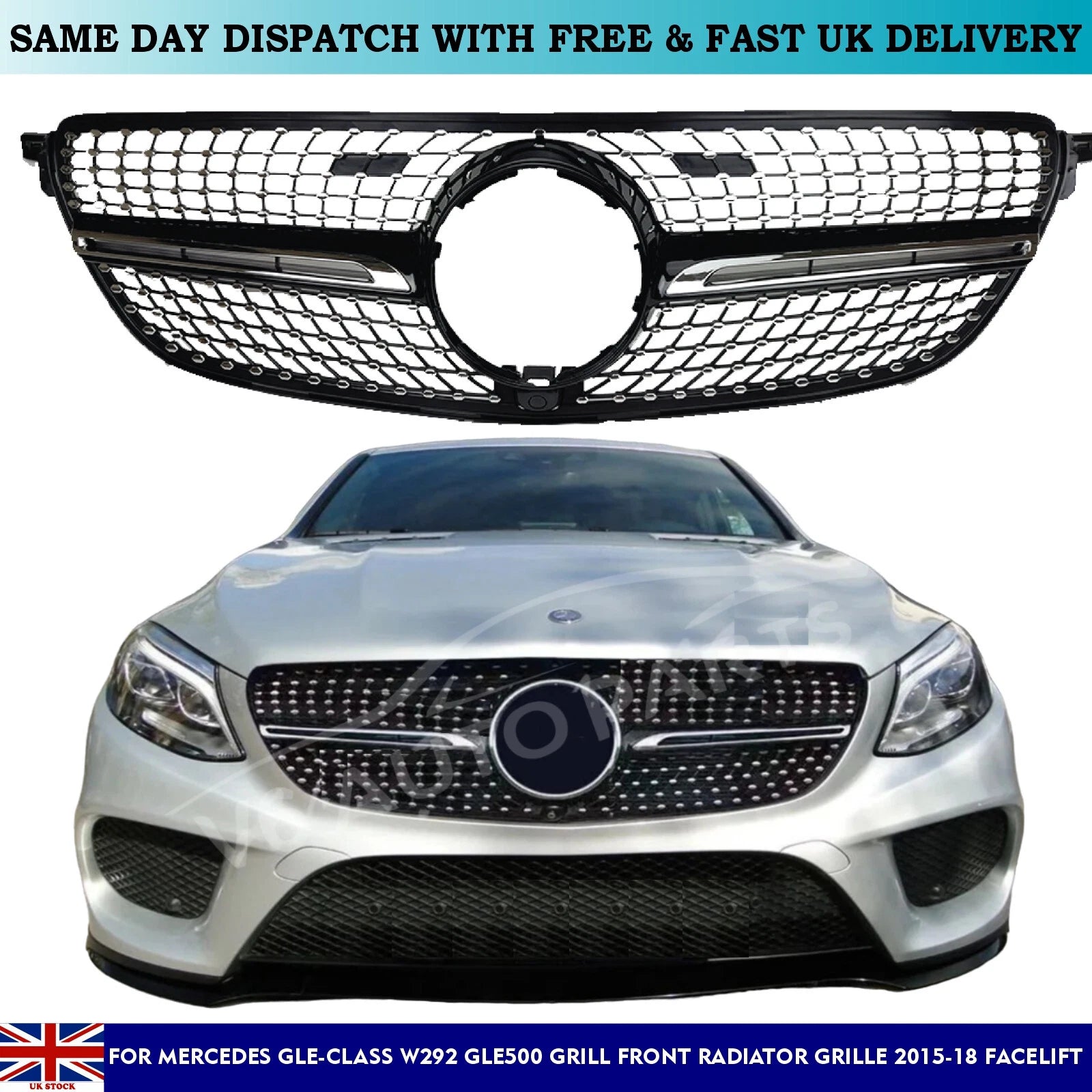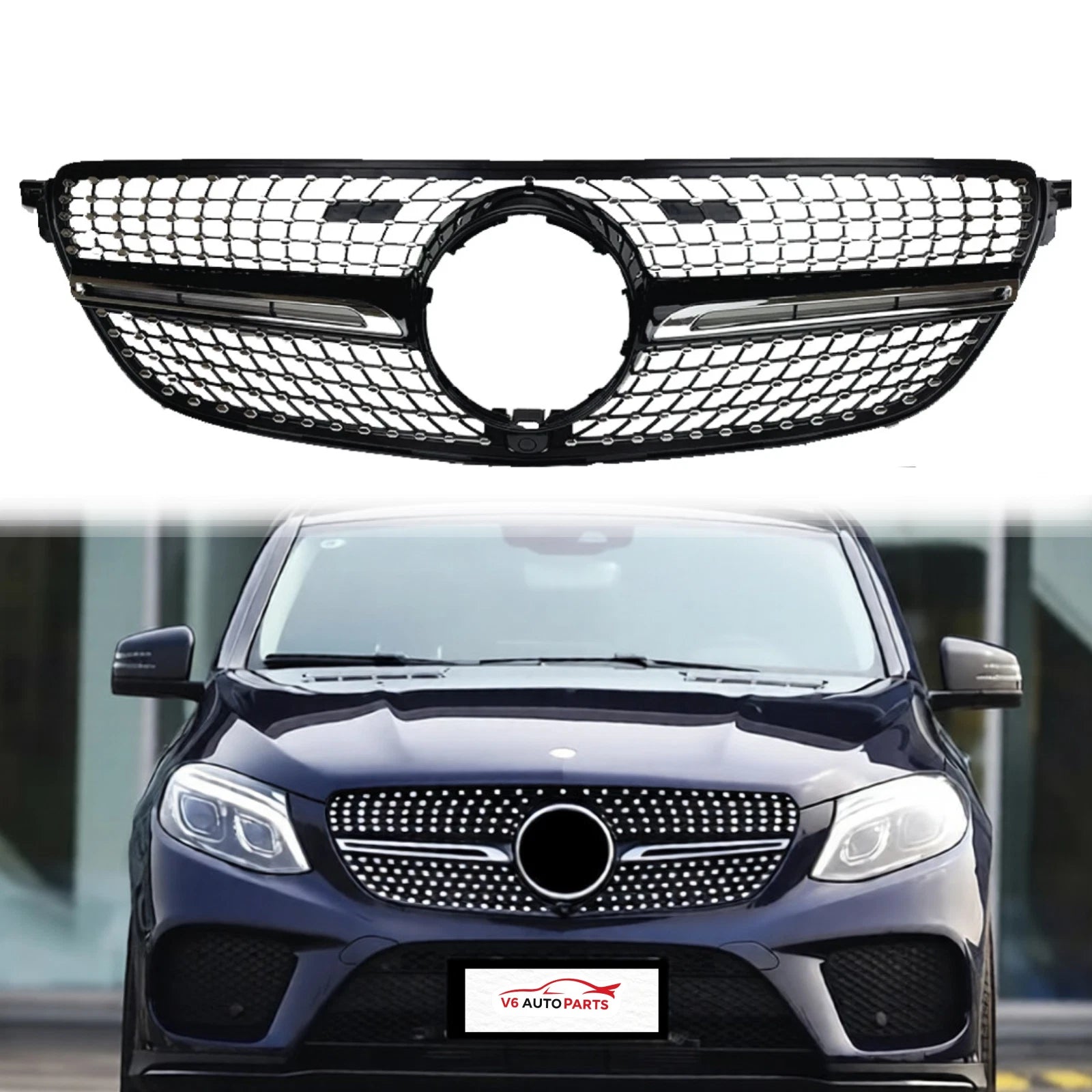 Upgrade your Mercedes-Benz GLE with this premium AMG Diamond Style Front Radiator Grille. Finished in Black with Chrome fins, this aftermarket grille is engineered for a perfect OEM-like fit on 2015–2018 GLE-Class W292 & C292 models.