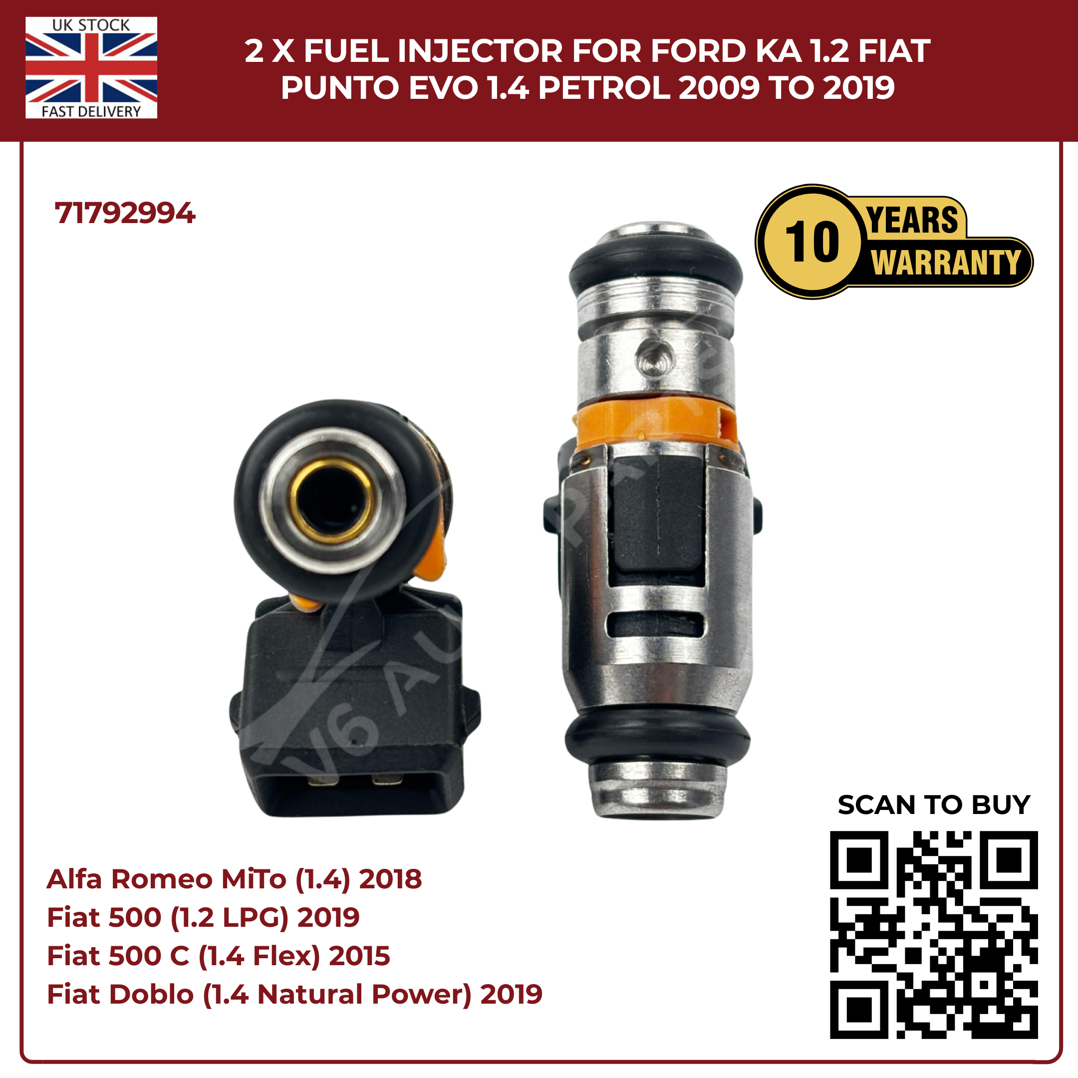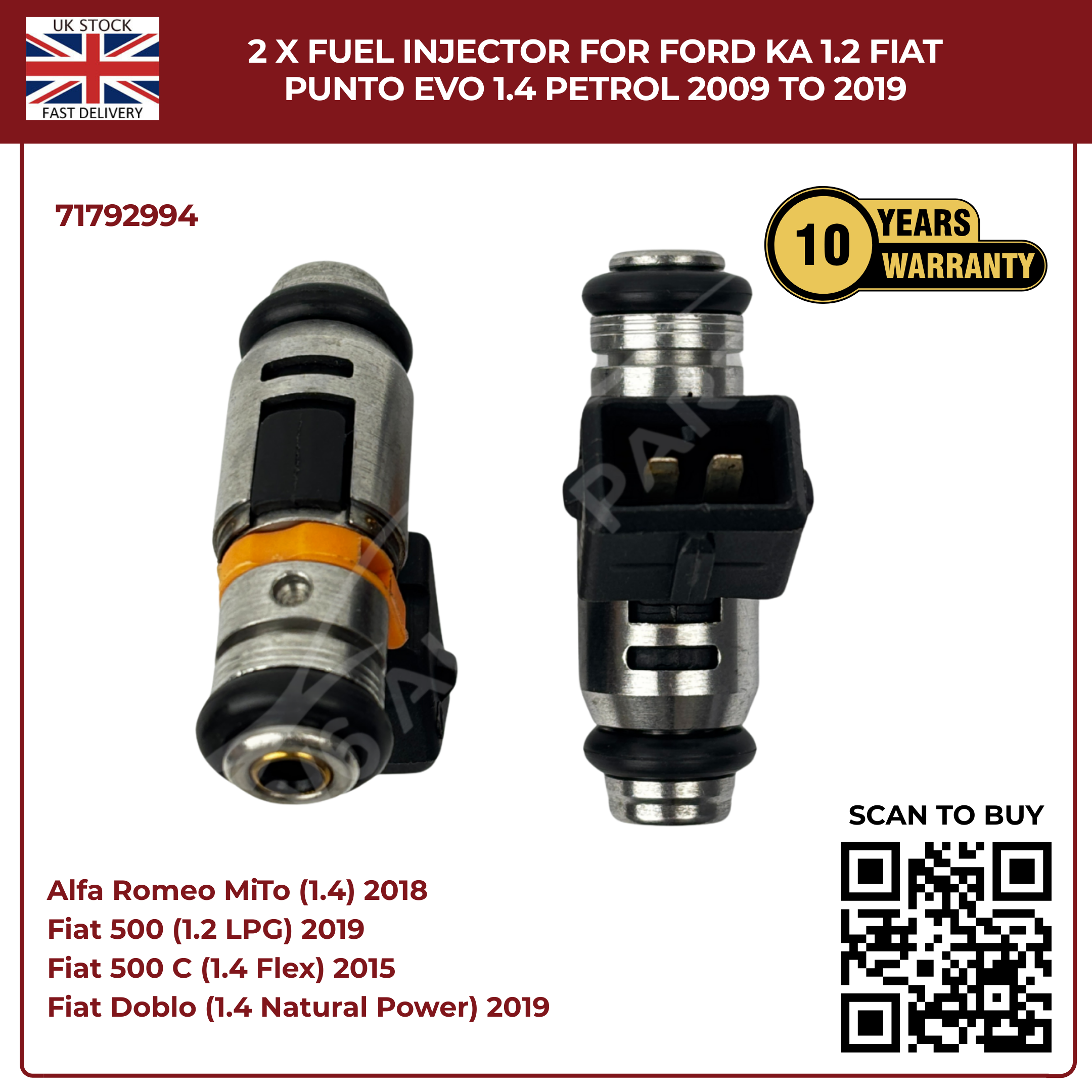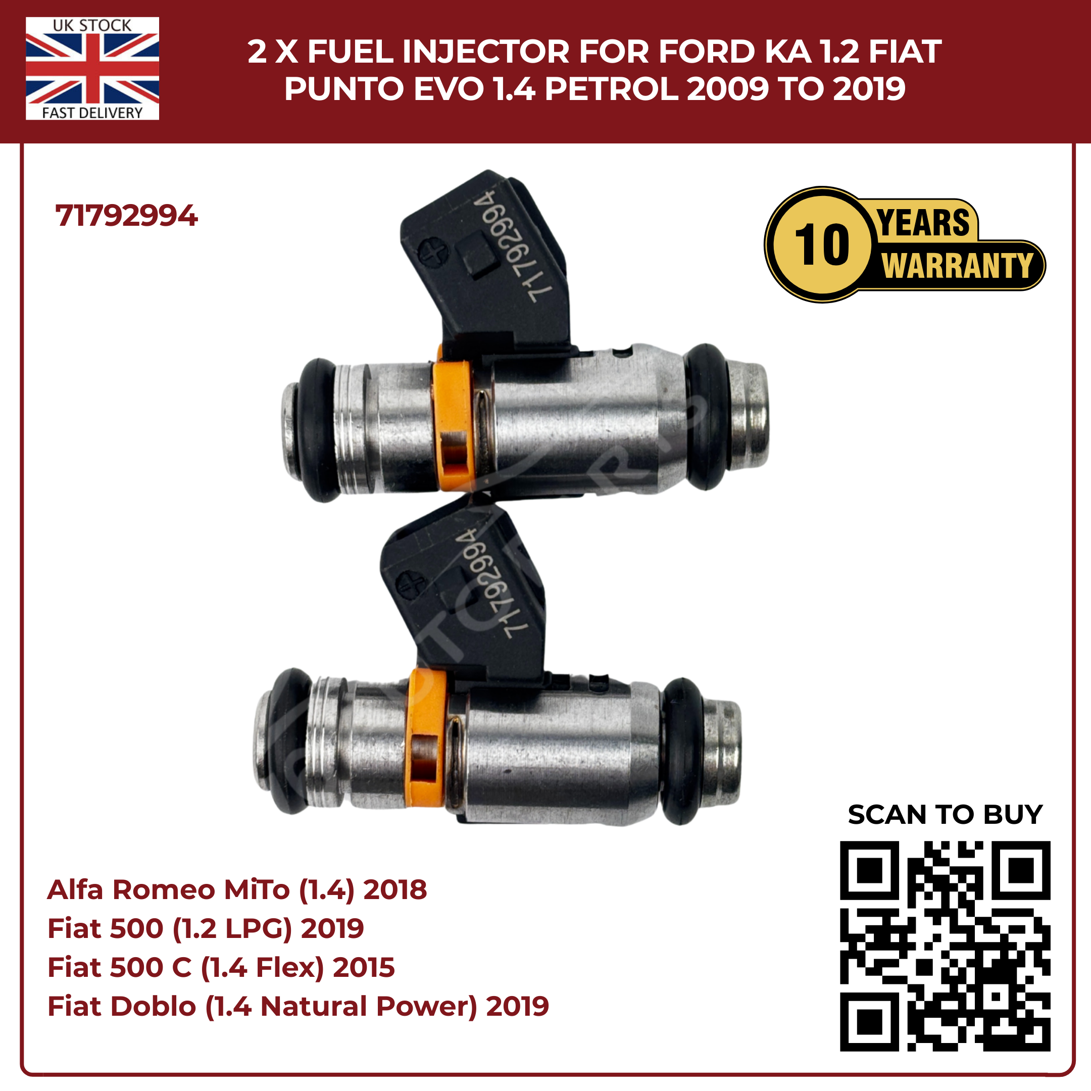 2× Fuel Injectors 71792994 – Fits 2009–2019 Ford Ka 1.2 & Fiat Punto Evo 1.4 Petrol