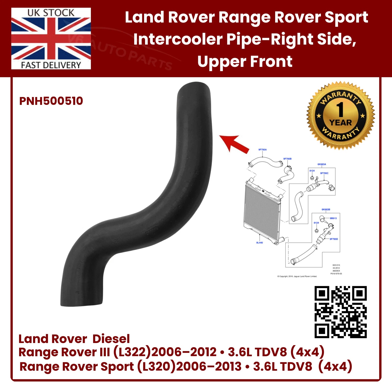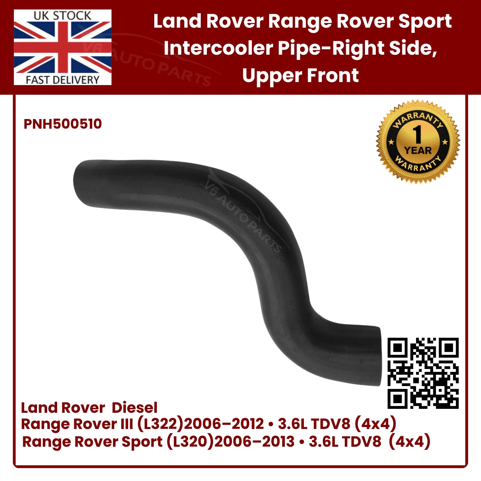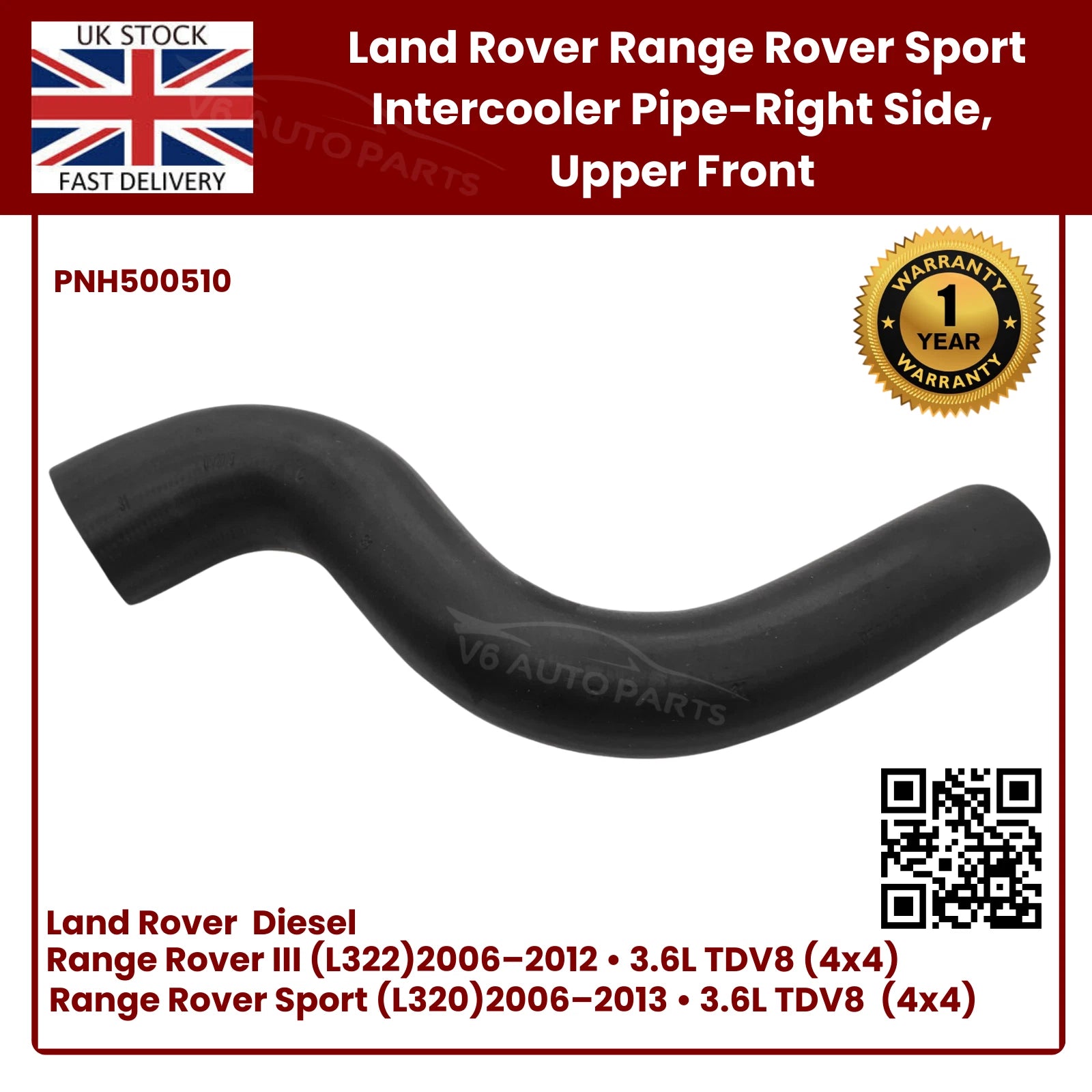 🚗 Brand New Intercooler Pipe Turbo Right – Land Rover Range Rover Sport 3.6L TDV8 Diesel (PNH500510)